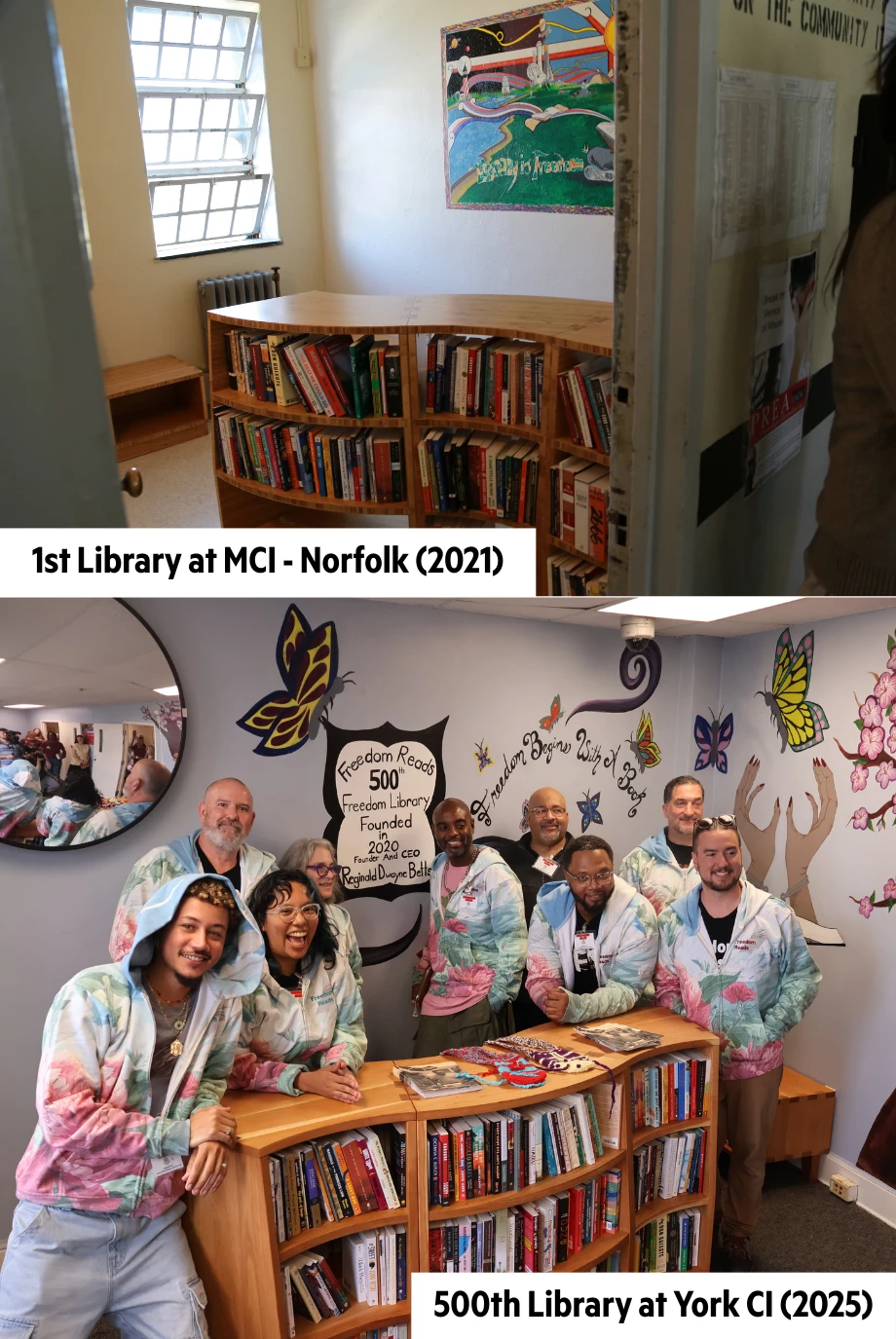And it’s humbling to think of what the Freedom Reads team just did: returned to York Correctional Institution, the women’s prison in Connecticut. This was the first prison where we opened a Freedom Library on every cellblock back in 2023. The women there at first wondered why we showed up. Some wondered who facilitated the beautiful curved bookcases and brand new books that we carried with us. I heard a story of how a correctional officer’s entire demeanor changed when he was given an Anthony Bourdain book and I remembered how all of us just desire to be seen. And realized we needed to bring a Freedom Library for staff at every prison as well. The prison let us know they opened two additional cellblocks and needed two more Freedom Libraries. And we returned with our 500th Freedom Library that the entire Freedom Reads team built together. I must say, though we’ve built 500 of these, that was the first that I’d put together, reinforcing for me that our work is a team effort. And you too are part of the Freedom Reads team.