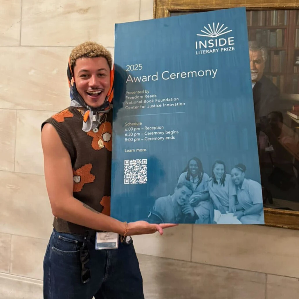 Freedom Reads' Library Coordination Manager, David Perez, at the 2025 Inside Literary Prize Award Ceremony at the New York Public Library.